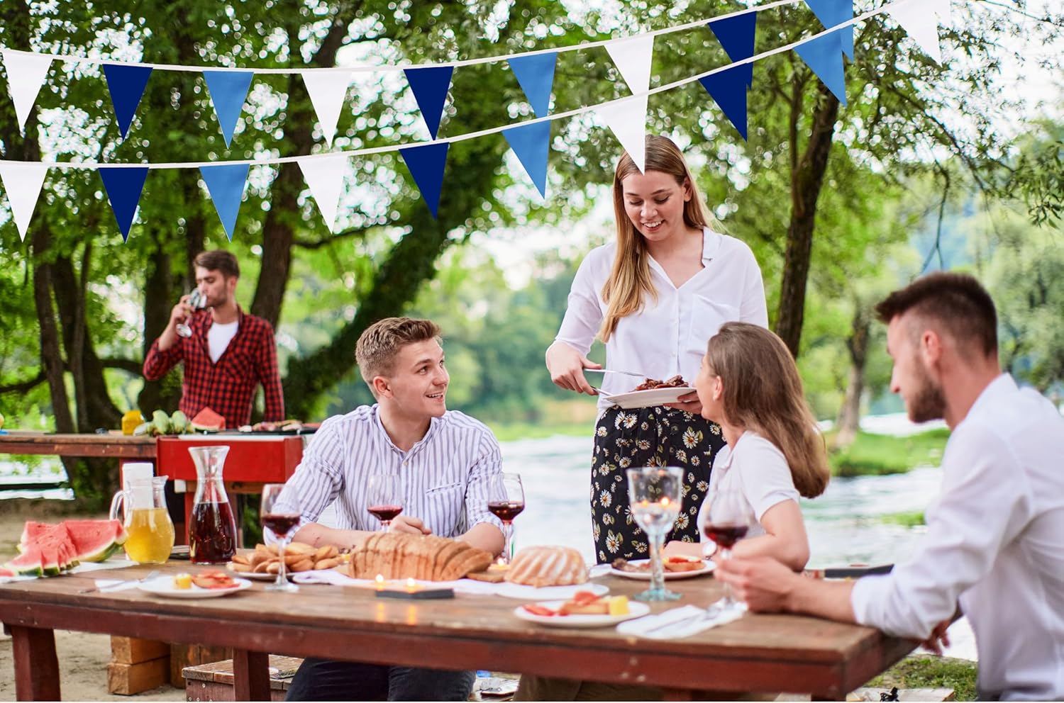 Brand: InMemory Color: Blue + White + Dark Blue Item Length: 100 feet 60 flags Material: Polyester Specification and Size: the size of a single flag is: 7x 11 inches,each string 50 feet long with 30 flags, 2 strings, total 100 feet 60 flags. Material: imported,made of 100% durable polyester, durable and reusable. here are ropes on both sides of the flag, which is convenient for operation and use, and easy to hang. Color: the color on both sides is uniform, bright, vivid, and there is no color difference. Anti-ultraviolet dyes are not easy to fade even after long-term use,suitable for indoor and outdoor use. Decorations for Various Holdays: in addition to holiday theme parties, these banners are also very suitable for bars, parties, backyards, schools, sports clubs, gardens, golf courses, playgrounds, offices, homes, and conference rooms to place flags. Customer Service: if you have any questions about the banner flags, please contact us, we will give you a satisfactory reply.