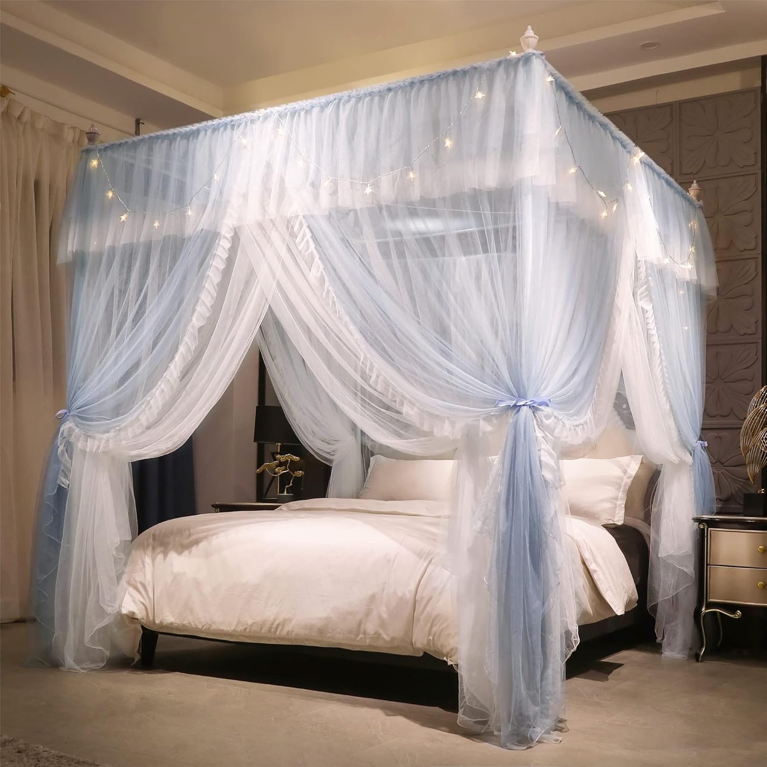 Brand: InMemory Color: Grey and White Material: Polyester Size: Twin / Full / Queen / King 100% Polyester Canopy Package Includes--Double Layer Bed canopy*1+ Rope15m+ Plastic wall anchors*4+ Ribbons*4 (LIGHTS And POLES IN THE PICTURE ARE NOT INCLUDED) Material and Size--It contains Multiple sizes. Please choose what you need. It is made of high-quality polyester fiber and feels soft and cozy (LIGHTS And POLES IN THE PICTURE ARE NOT INCLUDED). The double-layer mosquito net can not only effectively prevent mosquitoes, but also block the light and naturally protect your deep sleep. Fashionable Design--The ruffle design at the top makes your room romantic and elegant,Clever 4 openings double bed curtain design makes your bed full of romantic atmosphere. Realize every lady's fantasy of the princess.Practical and beautiful,making your bed canopy full of Princess flavor. Please note (The lights and poles in the picture are not included). Perfect Gift--Every girl has a princess dream. This Ruffle double bed curtain makes the girl's room full of romance and fulfilled all your fantasies about the princess.It is a perfect gift for family and female friends. It is suitable for birthdays, anniversaries, Christmas, mother's day, etc. Satisfied Service--If there is any questions please feel free to contact with us, our customer service team will response in 24 hours. If there is any part missing or damaged during shipping, please contact us first, we will solve the problem as the way you want.