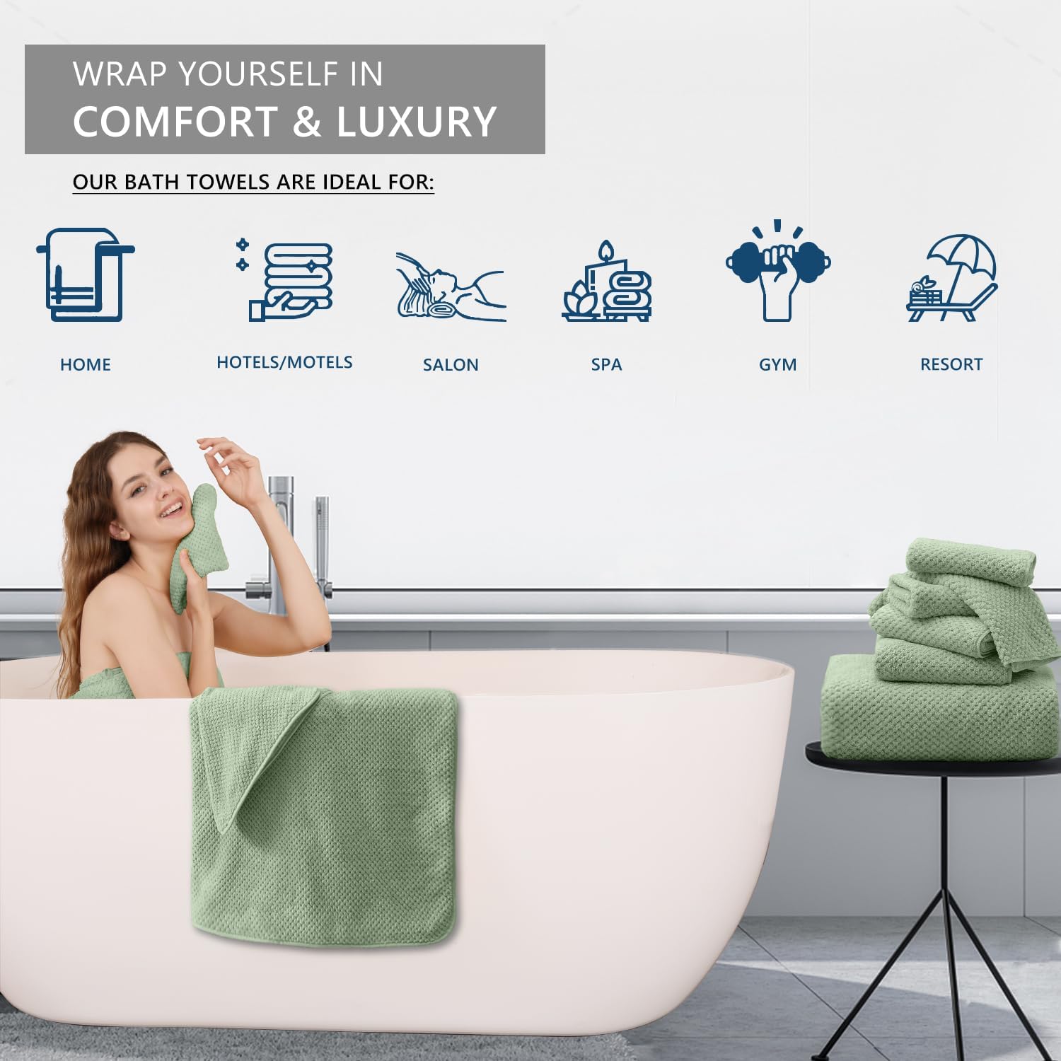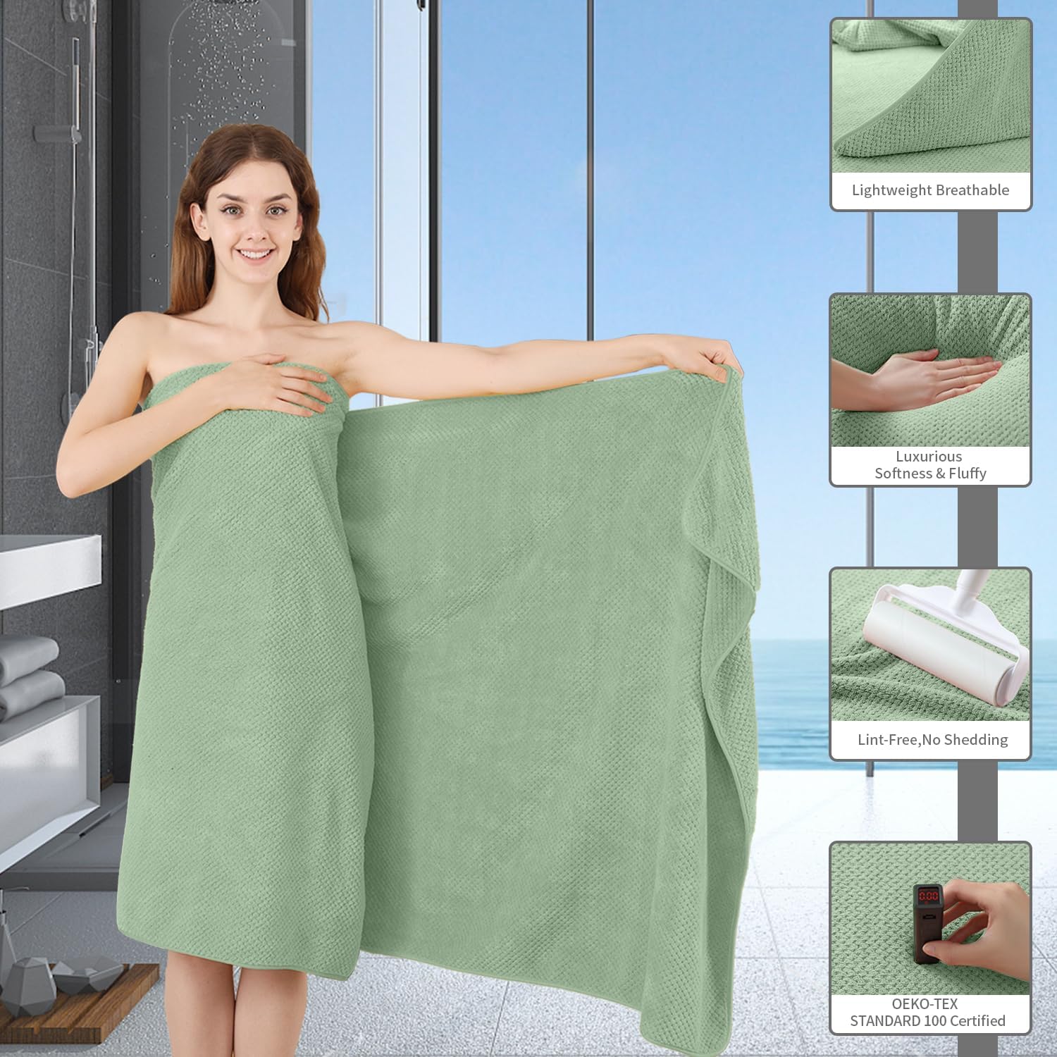 Brand: InMemory Color: Texture Green Material: Microfiber Product Dimensions: 70"L x 35"W JUMBO OVERSIZED BATH SHEET: 4 Piece Extra Large Bath Sheet size are 35x70 inches. oversized bath towels Can completely wrap your body,The naturally soft, breathable, and comfortable material of towel sets provides you a pleasing experience after bathing,you will enjoy the experience of softness,moisture absorption, luxury, lightness. The premium quality of luxury bath towels provides long-lasting strength and can be used for a longer period of time. HIGH QUALITY WATER ABSORPTION BATH SHEET: Premium bath towels,feel soft and cozy,bathroom towels have high water absorption and fluffy,towels very suitable for hands and body,Soft bath towels giving you a comfy experience after bathing, and bath towels can quickly absorb the moisture on your body,high quality microfiber bath towel ensure optimum softness, fluffiness and wonderful absorbency. MULTIPURPOSE TOWEL SET: Large bath towel sets can be used perfectly for various purposes including bathroom, hotel,beach,gyms,shower rooms,swimming pools, spas,hotels,salon, and as college dorm room essentials.These bathroom towels provide users with all the required bathroom drying needs either to dry your body or warp around your hair. SOFT TOUCH AND DURABLE: bath towel edges with professional hemmed seaming finish,towels have a reinforced double stitched hem,designed to prevent fraying and tearing. Your towel will be durable and maintain its best condition,The towel is soft and delicate, which is very suitable for people with sensitive skin. The soft looped cloth will not harm your skin. CARE INSTRUCTIONS: wash before use,Machine wash in cold,Tumble dry low,Do not iron,towels can absorb 10 times their weight in water makes quick drying large surface ,This towel can be washed and reused hundred of times which remain soft after multiple wash and dry cycles.
