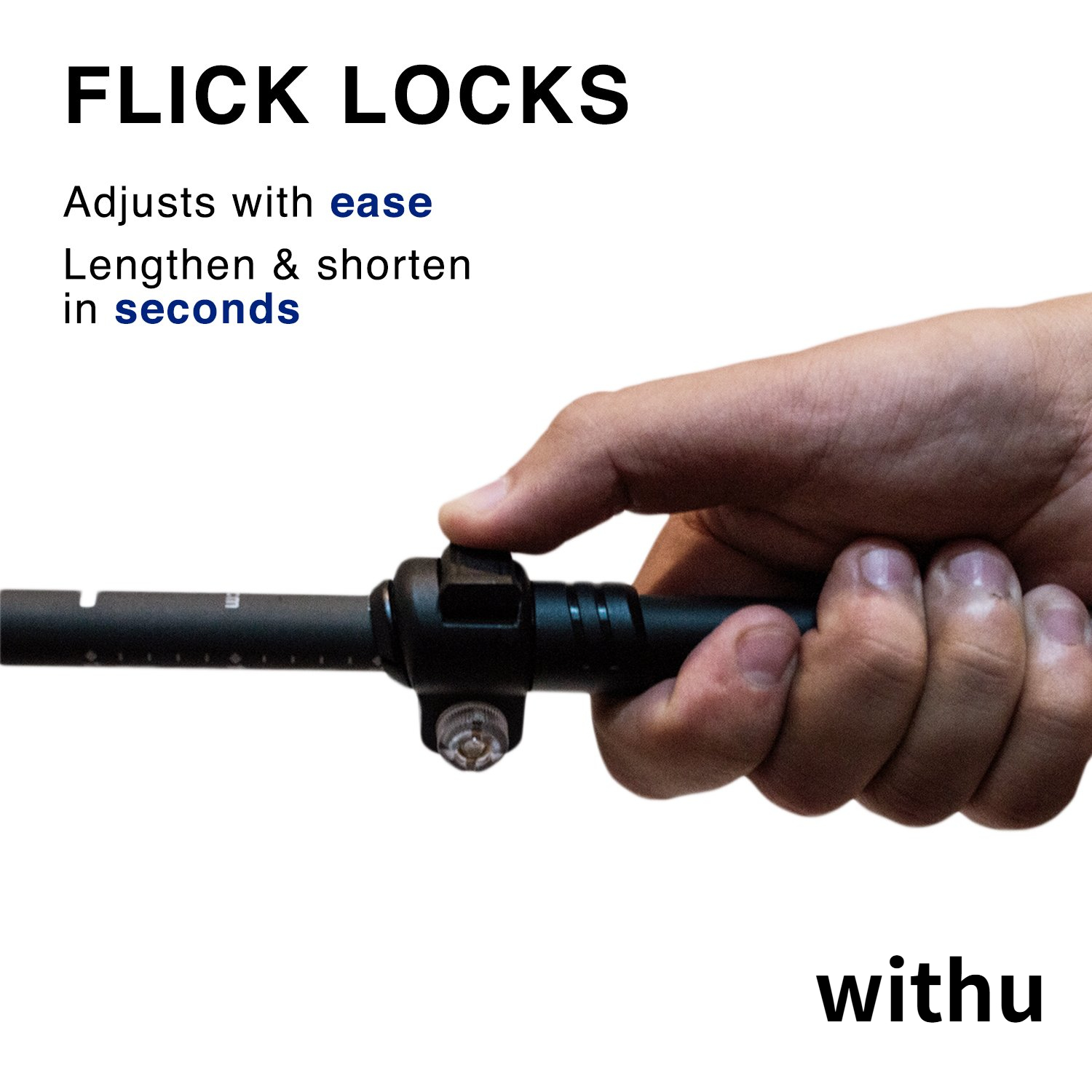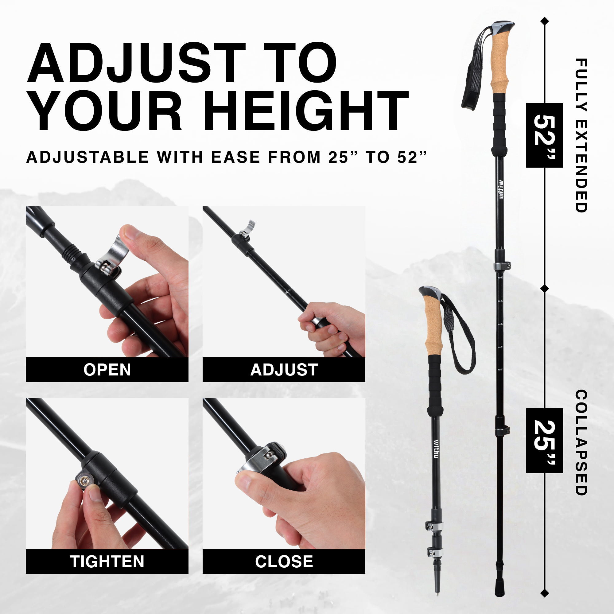 Brand: withu Material: Aluminum Color: Black Shaft Material: Aluminum Extended Length: 51 Inches Item Weight: 580 Grams Folded Size: 15.3 inches Included Components: 1 carry bag, 2 trekking pole Enhanced Support and Comfort: withu ergonomic and collapsible trekking poles provide superior support with cork grips that wick away sweat, ensuring comfort during long hikes and rugged terrain adventures. Durable and Reliable: Constructed from aircraft-grade aluminum with reinforced metal caps, these hiking poles are built to withstand tough terrains and heavy loads, offering exceptional durability over carbon fiber. Compact and Portable: The innovative collapsible design of these hiking sticks folds down to just 15.3 inches (39 cm), effortlessly fitting into backpacks, luggage, or duffel bags. Perfect for outdoor enthusiasts, they ensure easy travel and storage without compromising on performance. Adjustable and Customizable: Featuring advanced metal flip lock technology, these collapsible walking poles quickly adjust from 43.3 inches (110 cm) to 51.2 inches (130 cm), accommodating users from 5'2'' (159 cm) to 6'5' (195 cm) for ultimate convenience. Lightweight Construction: Each hiking pole weighs only 10.2 oz (290 g), making them ideal for all-day use, whether hiking, backpacking, skiing, or crossing streams, thanks to the use of high-grade lightweight materials. Ready for Any Adventure: Engineered for extreme conditions, these collapsible walking sticks are versatile for fishing, hiking, and skiing, providing the strength and reliability needed for all your outdoor activities.