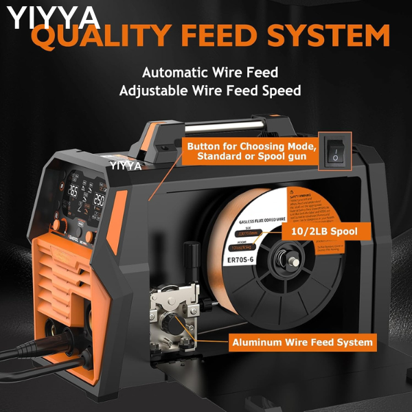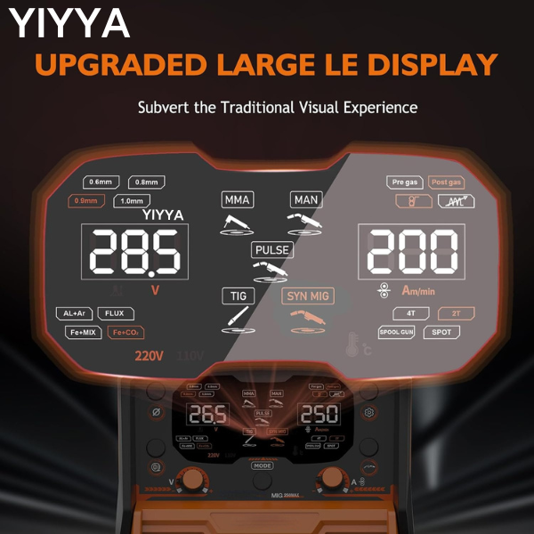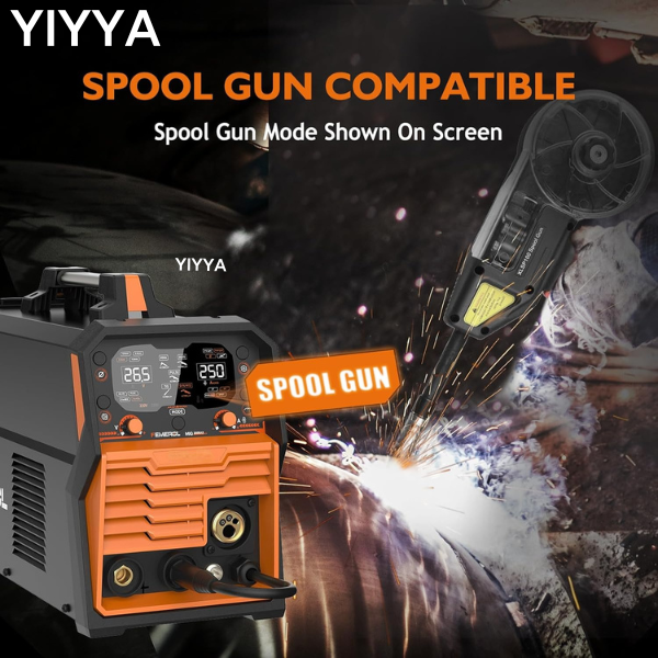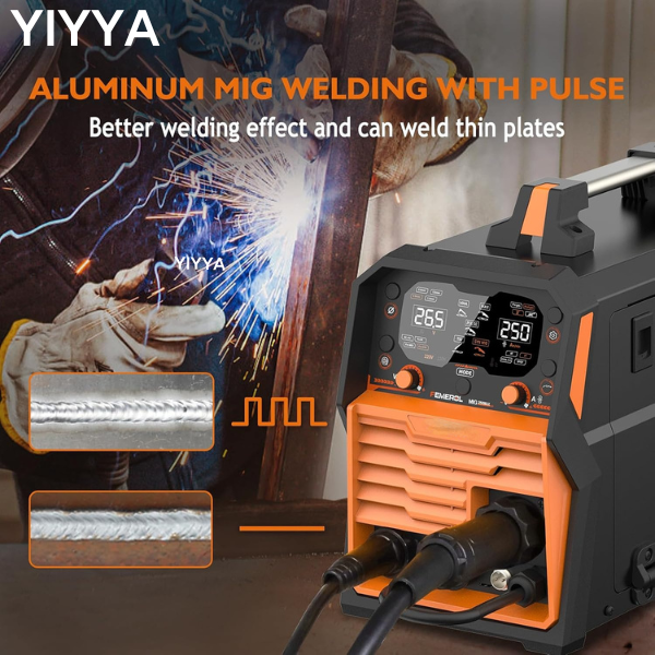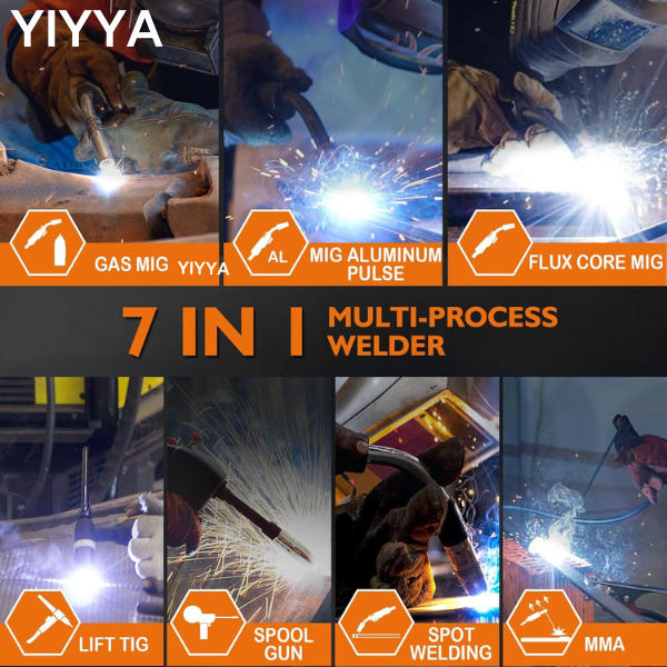 Brand: YIYYA Item Weight: 30.3 pounds Package Dimensions: 21.12 x 16.14 x 13 inches 7 in 1 Welding Machine: The multi-function welding machine included Gas/Solid Wire MIG,Pulse MIG, Gasless Flux Core MIG, Stick/MMA, Spot welding, Lift TIG, spool gun compatible (tig gun and spool gun not included,WP-17V-35,LBT150). Pulse MIG: Aluminum MIG welding with pluse can offer fast, high-quality, low spatter, and consistently great-looking welds than other MIG welder.Making aluminum welding easier. Upgraded Large LED Display: Exclusive human-computer Interaction LED screen design, provides you with accurate data display and read easier and more clear without taking off your helmet. Easy to carry with a handle,perfect for home DIY , farm work and construction sites. Synergic or Manual Control: When you selecting wire diameter and gas material,the welder will automatically match recommended current and wire feed speed.So, it’s very easy for beginners.Also, if you are experienced welder, you can choose MIG manual control,to adjust the welding current according to your personal welding habit. Wide Application: This MIG welder machine can be hold up to 2 lb/10lb spools. .023”/.030”/.035” solid wire, .030”/.035” flux core wire, .035”/.040”/.045” aluminum wire.Suitable for all kinds of welding requirements. Widely used in carbon steel, cast iron, stainless steel, aluminum,etc. Guarantee: Our welding machine is two years guaranteed,during this time,we guarantee any problem with this welding machine.