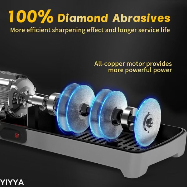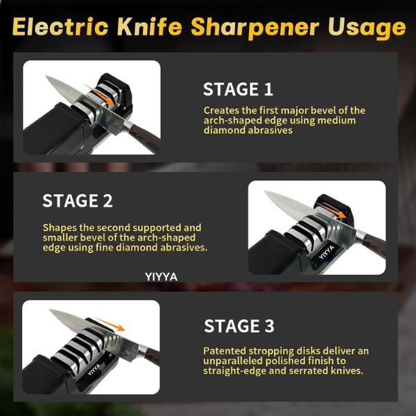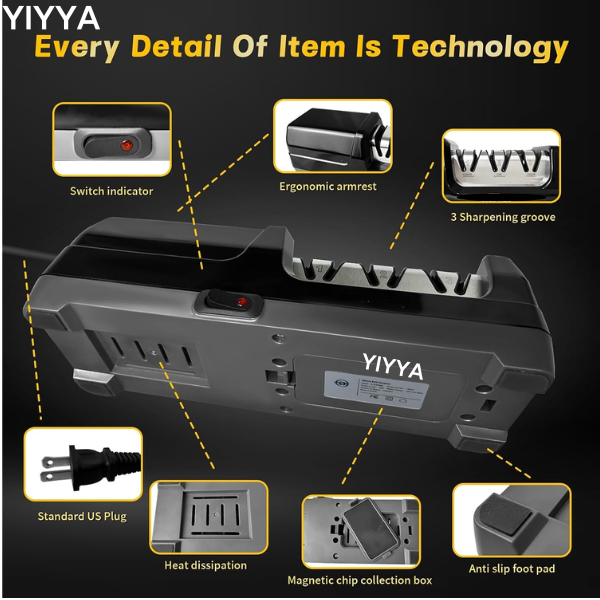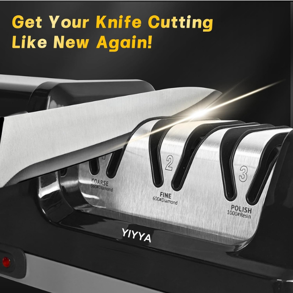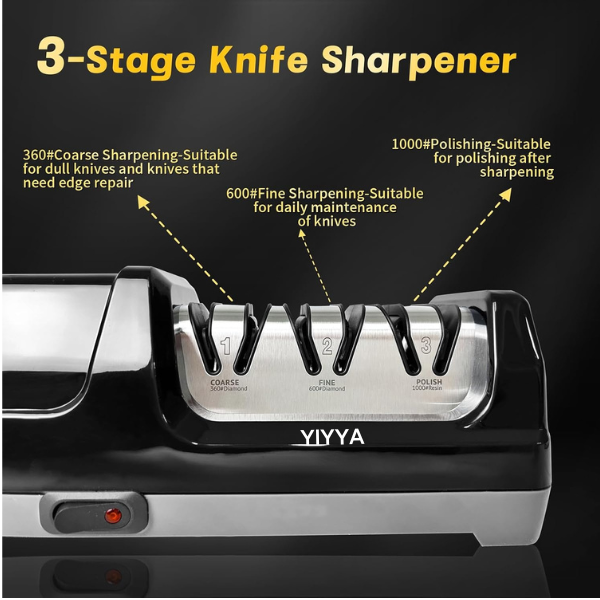 Brand: YIYYA Color: Black Material: Carbon Steel, Plastic Product Dimensions: 12"L x 4.92"W x 4.8"H Item Weight: 2 pounds Grit Type: Very Fine Number of Items: 1 Electric Knife Sharpener Effortless Sharpening: Tired of spending ages trying to sharpen your knives with traditional methods?Our Electric Knife Sharpener will optimize your kitchen experience!It features 3-Stage Sharpening、100% Diamond Abrasives、20° Precision Sharpening Angle and Magnetic Dust Collection Box. 3-Stage Kitchen Knife Sharpener: Our Knife Sharpener Electric is designed for use in the home kitchen. 3-stage knife sharpening includes coarse sharpening (sharpening dull knives), fine sharpening (daily maintenance of knives), and polishing (making the blade smooth and flat). 100% Diamond Abrasives: This electric knife sharpeners for kitchen knives uses a proprietary diamond abrasive(the hardest natural substance).Provides quick and easy sharpening without damaging your knives.Has a long service life. 20°Precision Sharpening Angle: This electric knife sharpener for all knives uses a 20-degree angle for sharpening and is equipped with a fixed-angle splint to evenly sharpen the entire blade.This feature makes our knife sharpener suitable for several kinds of straight blade knives, such as chef knives、slicing knives、santoku knives、paring knives etc. Magnetic Chip Collection Box: Our knife sharpeners for kitchen knives are equipped with a magnetic scrap collection box at the bottom, making it easy for you to clean up the metal scraps after sharpening.