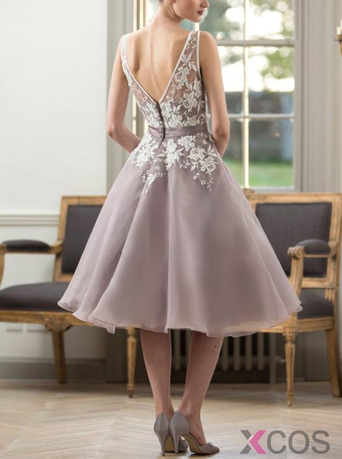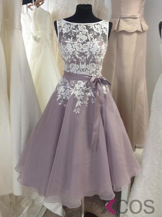 • Classic A-line Short Bridesmaid Dress with White Lace Appliques