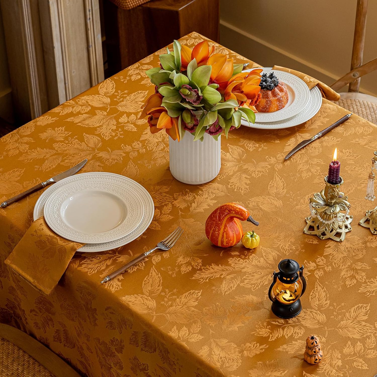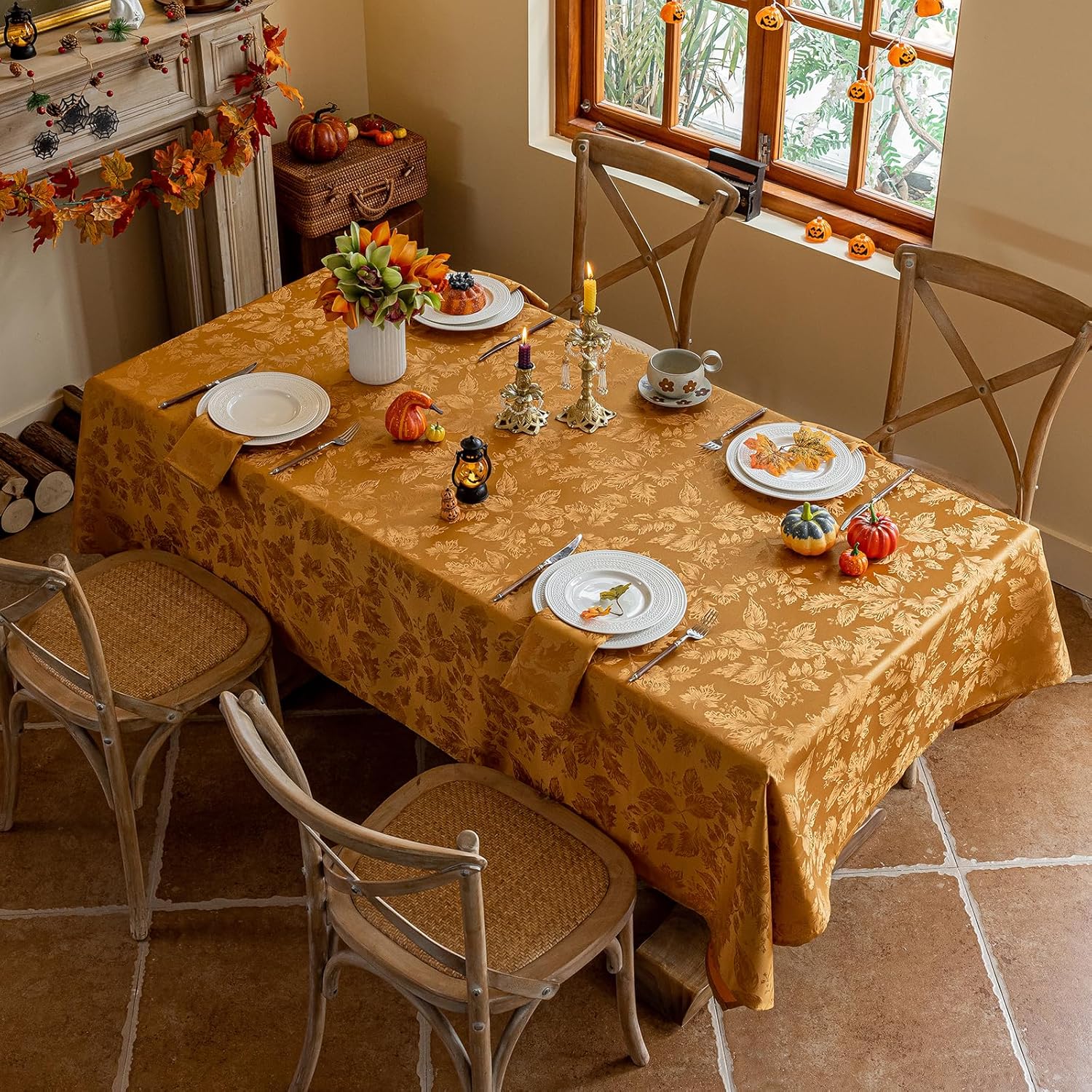 Brand: InMemory Size: 60x120 Inch (Customized sizes available) Color: Amber Material: Polyester Premium Quality: This durable tablecloth is made of high-quality polyester jacquard fabric to ensure the protection of your table and furniture. Made of well treated fabric, this table cloth is durable, smooth, soft, supple, spill-proof and wrinkle resistant. Design: Jacquard pattern is designed by fall’s maple leaves. Our designer integrated floral patterns with maple leaves on the luxurious polyester fabric to create a sense of beautiful and delicate feelings for your dining experience. Versatile Occasions: Suitable for your dining-room table, kitchen table, Cafes, restaurants, diners, catering, weddings, brunches, buffets, parties, picnics, outdoor patio table and more. It creates a wonderful and fall holiday feature for your family and friends to enjoy together. Easy to Care: Simply wipe with a damp tissue for effortless cleanup after dinner is the fastest way. Our polyester tablecloth is also machine washable and not easily deformed. Just put them in the laundry bag and wash them with cold water on gentle mode. Iron on low heat if required. Size Guide: [Rectangle,60" x 120" (10-12 eats)]:This tablecloth measures 60" Width x 120" Length (152 x 305cm),size deviation is between 1 to 2 inch,suitable rectangle tables and best for a table seating 10-12 chairs.