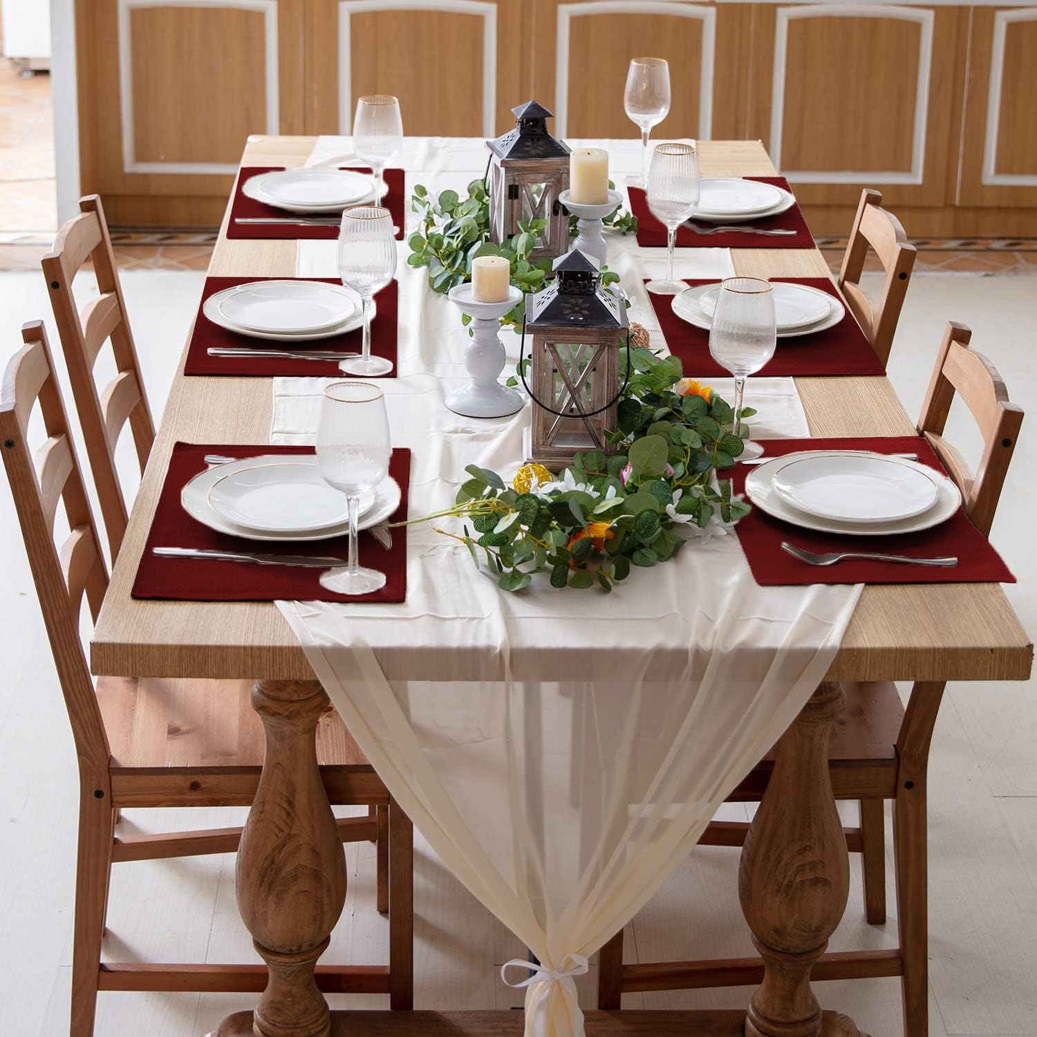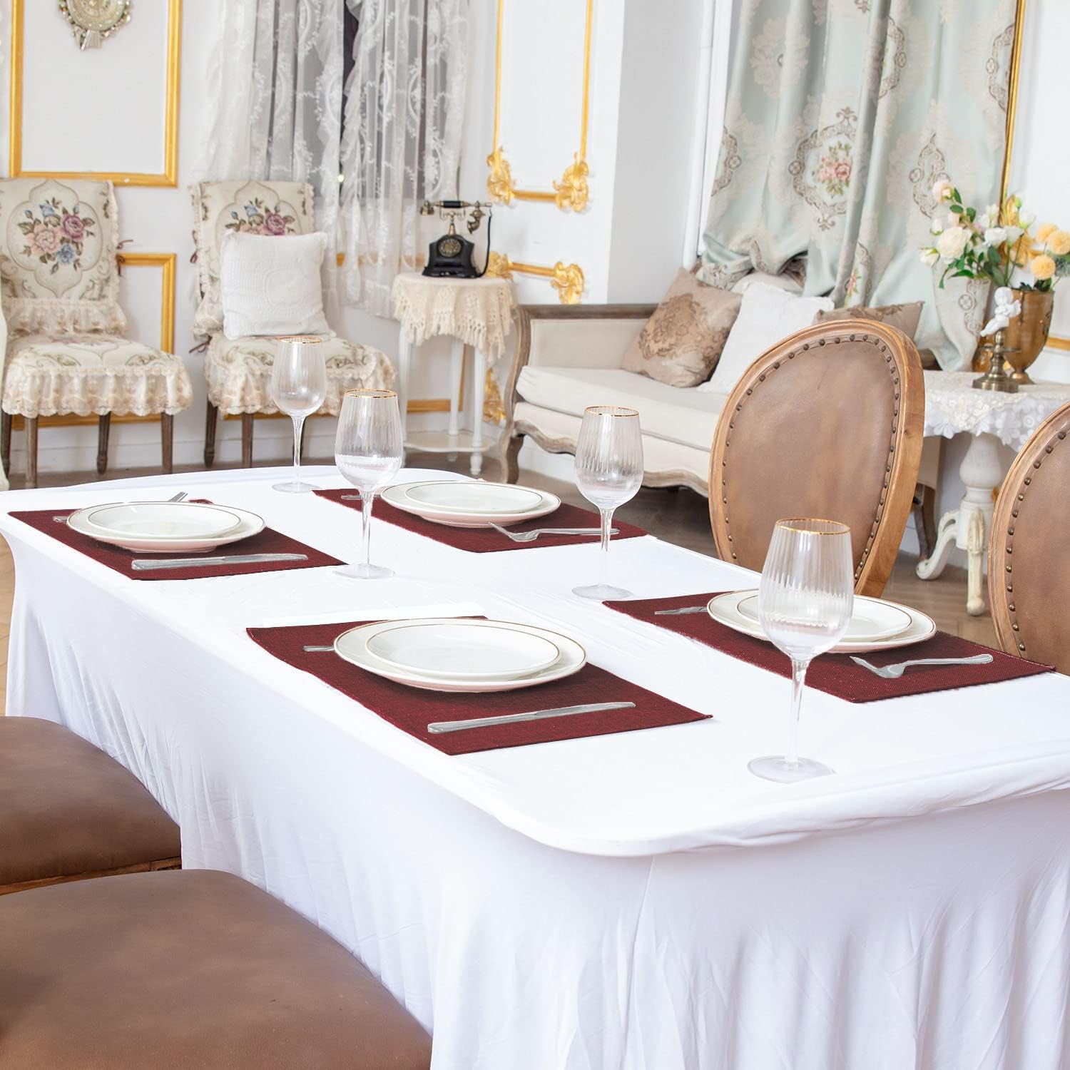 Brand: InMemory Color: Burgundy Material: Polyester Size: Placemats 12'' x 18'', Set of 8 PACKAGE AND SIZE: One pack includes 8 pieces of cloth placemats and Each Measures 17.7"*11.8" (45cmX30cm). NO napkins included. RUSTIC LOOKING, PERFECT FOR CHRISTMAS & NEW YEAR & HALLOWEEN & THANKSGIVING DECOR: Made by textured polyester fabric and designed like linen, our table mat has a rustic and cozy look. It effortlessly enhances your table settings and adds a warm, natural touch to your Christmas, New Year, Halloween and Thanksgiving dinner party, making it perfect for the season. DOUBLE LAYERS: Each placemat has double layers and both sides are usable. Its thickness is appropriate for protecting the table form hot plates, stain, scratches and some water droplets spilled from tableware. NOT waterproof. EASY TO CLEAN AND FLAT: Our fabric placemat is machine washable and hand washable, Low temperature drying or lay flat to dry, Low iron if needed. Nearly no wrinkles or shrinkage after washing and drying. CELEBRATE EVERY FESTIVAL & DAY: From spooky Halloween dinners to grateful Thanksgiving feasts and joyful Christmas gatherings, our placemats are designed to be the star of your seasonal table. When the holidays are over, their classic design and durable construction make them a practical and stylish choice for daily dining, ensuring year-round table protection and elegance.