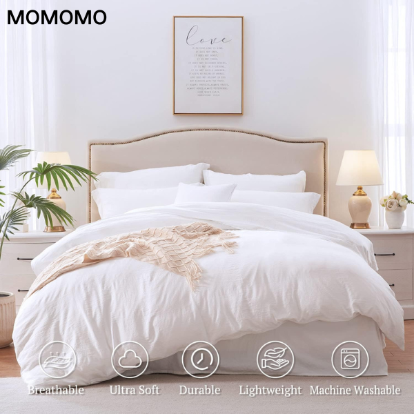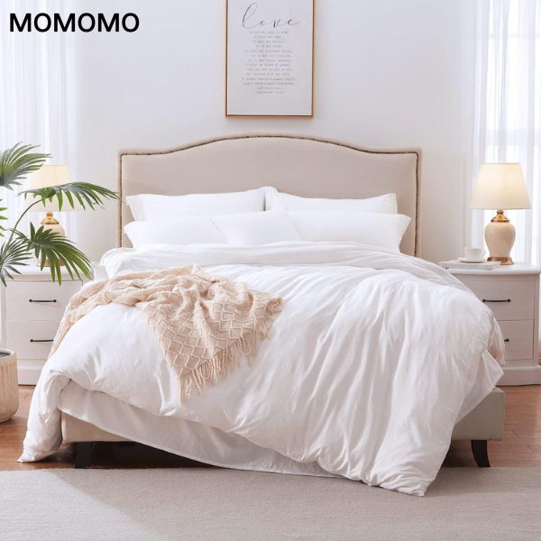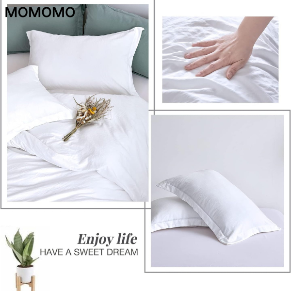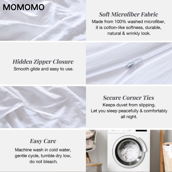 MOMOMO Super Soft Duvet Cover - 100% Washed Microfiber Comforter Cover Set 3 Pieces with Zipper Closure & Corner Ties (No Comforter) Brand: MOMOMO Color: Bright White; Aqua Sky; Haze Blue; Dark Grey Size: Twin (68"x90") / Full (80"x90") / Queen (90"x90") / King (104"x90") Material: Microfiber Pattern: Solid Package: 2 Pieces solid color duvet covet set; 1pcs twin size duvet cover Premium Material: Utilizing 120GSM washed microfiber fabric which is super soft, comfortable, breathable, non-fading and non-shrink after washing. MOMOMO duvet cover set providing exceptional softness and utmost coziness year-round. Ultra Soft & Comfortable: After being specially washed process, MOMOMO washed duvet cover set is softer and more comfortable than almost fabric. The trendy color offers an elegant, simple and stylish look for your bedroom. These duvet covers are available in a wide range of vibrant colors to match any bedroom decor well. Zipper Closure & Corner Ties: Hidden zipper closure design, easy to put your duvet in and out, four ties in each corner of duvet cover keep insert in place. Let you sleep peacefully & comfortably all night. All of the fabric and accessories passed OEKO-TEX STANDARD 100. Easy Care: Machine wash on a gentle cycle or hand wash in low-temperature water separately. Please do not bleach and do not dry clean. Low-temperature drying. Iron on low heat if needed.
