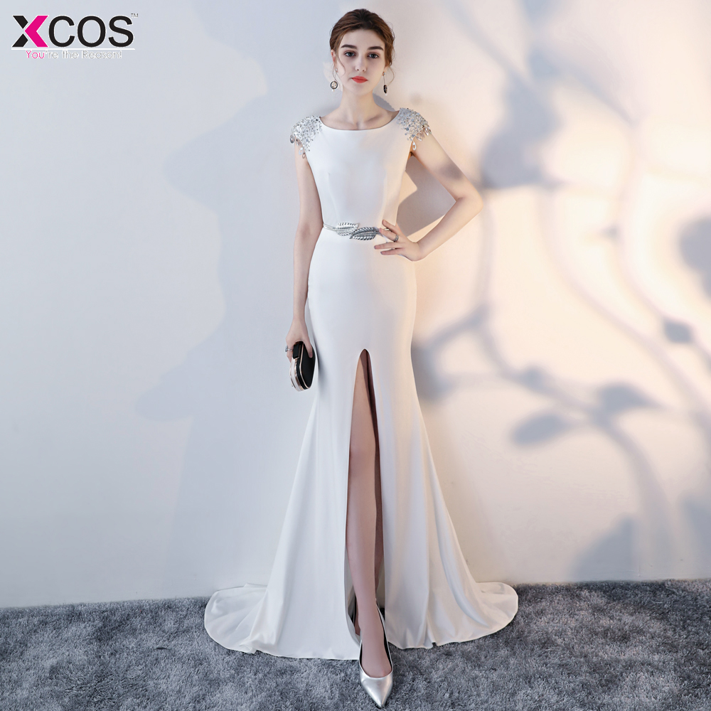 Sexy White Slit Front Beaded Crystal Long Evening Dresses with Belt 2018 Scoop Formal Long Evening Gowns Mermaid Prom Dress