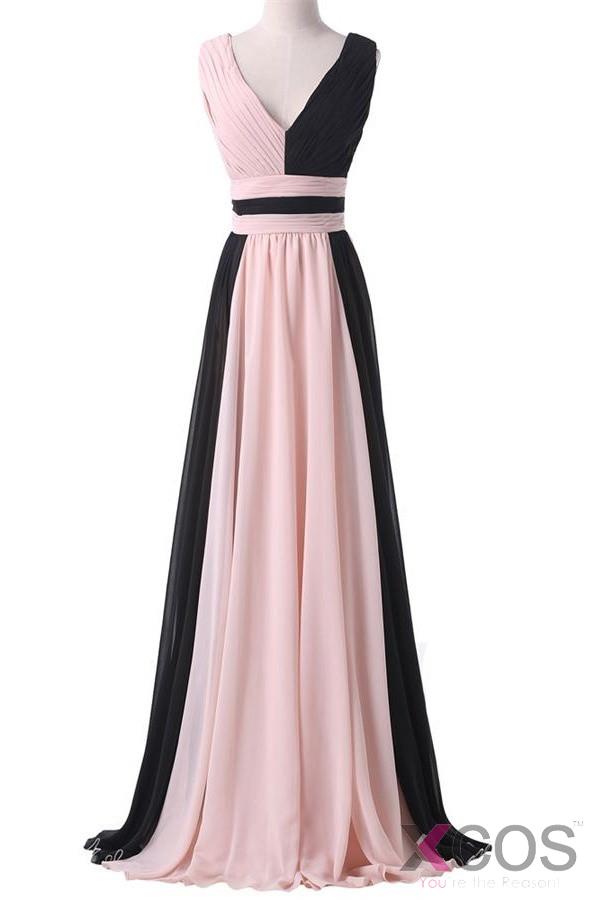 • Simple Cheap Pink And Black Long Chiffon Prom Dresses OK25