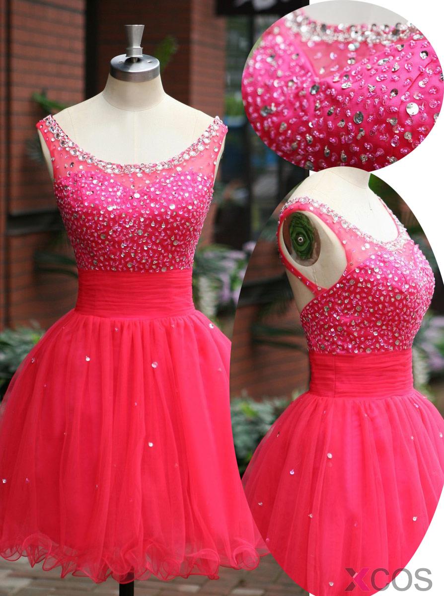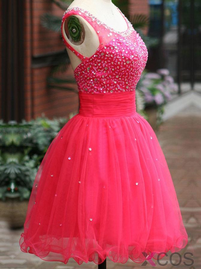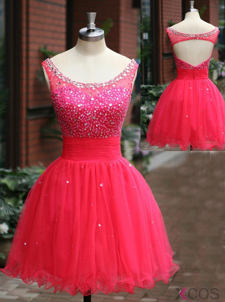 • Simple Dress Short Scoop Beading Tulle Backless Tulle Prom Dresses/Homecoming Dresses TUPD-7158