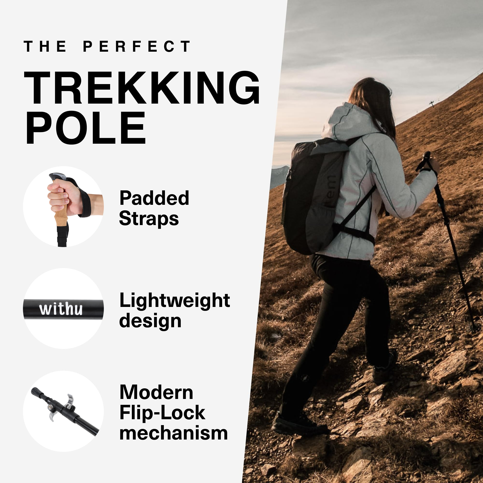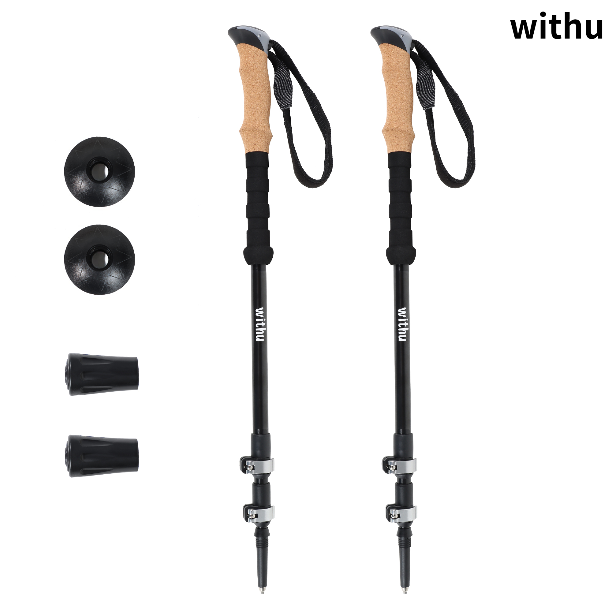 Brand: withu Material: Aluminum Color: Black Shaft Material: Aluminum Extended Length: 51 Inches Item Weight: 580 Grams Folded Size: 15.3 inches Included Components: 1 carry bag, 2 trekking pole Enhanced Support and Comfort: withu ergonomic and collapsible trekking poles provide superior support with cork grips that wick away sweat, ensuring comfort during long hikes and rugged terrain adventures. Durable and Reliable: Constructed from aircraft-grade aluminum with reinforced metal caps, these hiking poles are built to withstand tough terrains and heavy loads, offering exceptional durability over carbon fiber. Compact and Portable: The innovative collapsible design of these hiking sticks folds down to just 15.3 inches (39 cm), effortlessly fitting into backpacks, luggage, or duffel bags. Perfect for outdoor enthusiasts, they ensure easy travel and storage without compromising on performance. Adjustable and Customizable: Featuring advanced metal flip lock technology, these collapsible walking poles quickly adjust from 43.3 inches (110 cm) to 51.2 inches (130 cm), accommodating users from 5'2'' (159 cm) to 6'5' (195 cm) for ultimate convenience. Lightweight Construction: Each hiking pole weighs only 10.2 oz (290 g), making them ideal for all-day use, whether hiking, backpacking, skiing, or crossing streams, thanks to the use of high-grade lightweight materials. Ready for Any Adventure: Engineered for extreme conditions, these collapsible walking sticks are versatile for fishing, hiking, and skiing, providing the strength and reliability needed for all your outdoor activities.